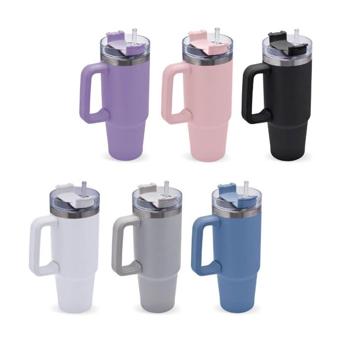 Doble pared. Cerrado al vacio. Pared interna y externa acero inoxidable. Tapa de plastico con cierre de rosca y sobretapa giratoria de tres posiciones con ranura para popote. Incluye popote y asa de plastico. Mantiene temperatura caliente 6 hrs y temperatura fria 8 hrs aproximadamente. Incluye caja individual.